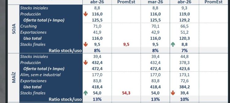 El balance mundial de oferta y demanda de abril no introdujo cambios para las cifras de stocks finales de soja y maíz norteamericanos, con el trigo subiendo su cifra, contrario a lo esperado por los analistas privados. A nivel mundial, se ajustaron a la baja los stocks finales de soja, cuando el mercado esperaba subas. El maíz sumó 2 Mt, reforzando un sesgo bajista para el precio. El trigo global sumó 6,1 Mt en su ajuste intermensual de stocks finales.
